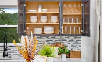 At the heart of Serotonin Chalet lies the open-concept living and kitchen area, featuring 16 ft. tall ceilings and magnificent floor-to-ceiling windows that offer uninterrupted views of the mountainous landscape and alpine pond. The blue stain pine ceiling sets the perfect modern cabin ambiance, complemented by the wood pellet fireplace, brand-new furniture, and remote-controlled blinds. Despite the feeling of being worlds away, you can stay connected with the 50" smart TV, 200mb Starlink WiFi, and Bluetooth-enabled record player.