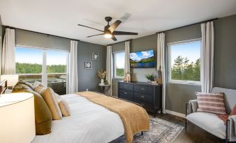 The primary bedroom, located adjacent to the living room, features a brand-new king memory foam bed for exceptional comfort. Lie in bed as long as you like, soaking in the serene mountainscape and aspen grove visible through the windows. This bedroom also offers access to a soaking tub with mountain views, a shower, and a walk-in closet, which can be closed off from the toilet and dual vanity area accessed via another door from the living area.