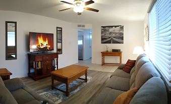 You will find three large bedrooms with three large beds. Hypoallergenic Natural latex mattresses with hypoallergenic down free alternative bedding. The home has a large living room with a 60” Smart TV and a dining room with a large table and seats for up to 8. The Kitchen if fully stocked with all stainless steel appliances, Kurige Coffee machine and everything you will need to make a nice meal. Both Bathroom have been recently remodeled with new tile, sinks, fixtures and amenities. The dining room has French doors that open out to backyard with a covered patio, gas grill, pool and a large deck. Both the front and backyards are trimmed with palm trees and native plants with a drought resistant desert landscape.