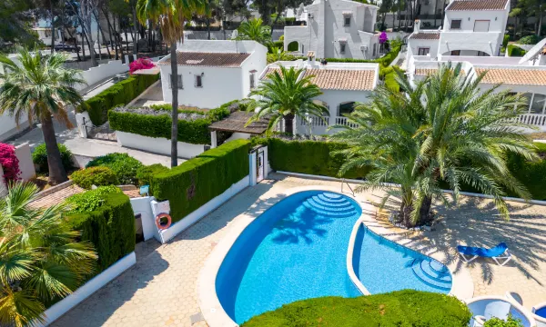 The TV is only Smart TV. Very modern, beautiful bungalow "Los Limoneros de Moraira", detached. 1 km from the centre of Moraira, 13 km from the centre of Calpe, in a quiet, sunny position residential area (villas), traffic calmed area, 300 m from the sea, 300 m from the beach. For shared use: property (fenced), swimming pool (12 x 7 m, seasonal availability: 01.Jan. - 31.Dec.). Outdoor shower. Private: property (fenced), garden. Terrace, garden furniture, barbecue. Grocery 1 km, supermarket 1 km, restaurant 300 m, bus stop 200 m, sandy beach "Playa Plagetes" 300 m (small), rocky beach "Cala L´Andragó" 600 m. Sports harbour 1.8 km, marina 1.8 km, golf course (12 hole) 2 km. Nearby attractions: Aqualandia, Mundomar, Terra Mítica, Terra Natura, Benidorm Palace (Benidorm), Les Fonts de l'Algar, Castillo de Guadalest, Peñon de Ifach. The owner does not accept any groups. "Los Limoneros de Moraira", 3-room house 72 m2. Spacious and bright, beautiful and modern furnishings: open living/dining room with TV, air conditioning and forced-air heating. Exit to the garden, to the terrace. 1 room with 1 french bed (1 x 180 cm, length 200 cm), satellite TV, air conditioning, fan and forced-air heating. 1 room with 2 beds (90 cm, length 200 cm), air conditioning, fan and forced-air heating. Open kitchen (oven, dishwasher, 4 ceramic glass hob hotplates, toaster, kettle, microwave, electric coffee machine). Shower/WC. Large terrace. Barbecue, deck chairs, sitting area. View of the resort. Facilities: washing machine, dryer, iron, children's high chair, baby cot for up to 2 year olds, hair dryer. Internet (WiFi, free). Parking (roofed). Please note: non-smoking house. CV-VUT0517422-A ESFCTU0000030380007911750000000000000CV-VUT0517422-A2