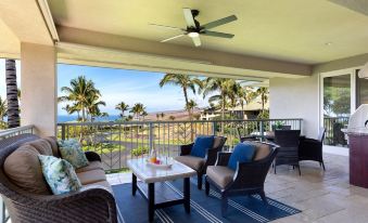 The indoor/outdoor living provides magnificent ocean, coastline, sunset, Kohala Mountain, and Maui views, providing an idyllic setting for year-round enjoyment. The condo has a spacious one-car garage with storage and one uncovered undesignated parking stall.
