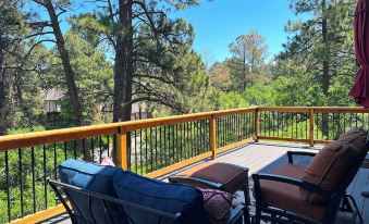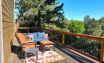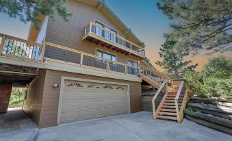 * Upper-Level Living Room: Boasts an authentic wood fireplace and access to a large, relaxing deck with outdoor furniture.
