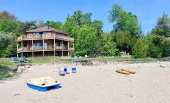 The backyard features green grass that opens up to a gorgeous sugar sand beach right on Lake Michigan. While most of nearby beaches in the area are either pebble, rock, or limestone covered, our beach is completely soft sand which extends out into Lake Michigan.