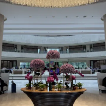 Sảnh đợi rộng rãi và thoáng đãng, trần cao đến tận trần nhà. Cảnh quan từ cửa sổ phòng thật ngoạn mục, với cây xanh tươi tốt và hồ nước, một trải nghiệm thực sự sảng khoái. Phòng cao và rộng rãi, có khu vực ướt và khô riêng biệt trong phòng tắm, bồn rửa đôi và bồn tắm. Nội thất và tiện nghi tổng thể hơi cũ kỹ.
