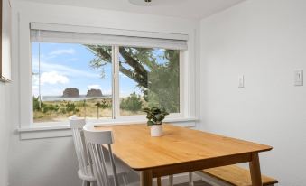 The Ocean Rogue Inn is an absolute gem that sits on the edge of the sandy beach beach just seconds away from the ocean. There is a wonderful community area that offers ample seating around a fire-pit, a sandy volleyball court, and epic views of Twin Rocks Arch sitting just off the shore in the Pacific Ocean.
