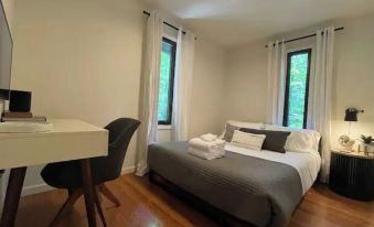 The bedrooms are perfectly staged with Queen sized platform bed front and center, a small side table with Sonos speaker, small bedside fans, and a reading light perfect for those book lovers. The main bedroom has a closet for storage, a desk, and a chair with a TV that can also be a secondary monitor or gaming for those in need. The guest bedroom has a small cabinet for folded clothing and an in-unit washer & dryer.