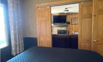 Further ahead will be the single bedroom. This room features a dressed queen size bed with a stunning view of the lake, ceiling fan, nightstands with warm lights for reading, carpeted floors, and a full sized closet stocked with various blankets (for warmth on a chilly night or to have around the campfire). The bedroom also features pocket doors to allow you to open or close off the space between the bedroom/living room.