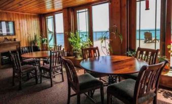 Once you set your bags down, you will probably want to make your way to the living room. The combination of sweeping Superior views, pine walls, and brick fireplace* make this the ultimate room for relaxation. Grab a book or just kick back and relax on the comfortable love seat/chair - don't forget the foot stools! The living room has multiple tables to be used for games/storage and a variety of lamps for you to adjust the lighting. Make yourself at home or grab the pair of binoculars(currently being replaced and not available)off the mantle and go sight seeing! There is also a TV with VHS/DVD player and dish. Wi-Fi is included in the room and lobby.