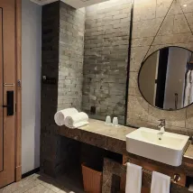 Phòng đầu tiên mình nhận rất nặng mùi khói thuốc nên mình yêu cầu đổi không gian bên trong ổn, cơ sở vật chất còn khá mới, tuy nhiên vệ sinh hơi thiếu giấy vệ sinh khi lau lên hơi ố vàng. bệ toilet nên tôi đặt cái bệ toilet mang theo. Đồ ăn sáng cũng bình thường, không đa dạng, đồ ăn ở mức trung bình, không có gì muốn ăn, dưa hấu hơi chua, hoành thánh. vị ngon hơn