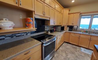 The Kitchen is generously equipped and is a beautiful space to spend time cooking awhile enjoying the views.