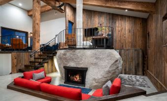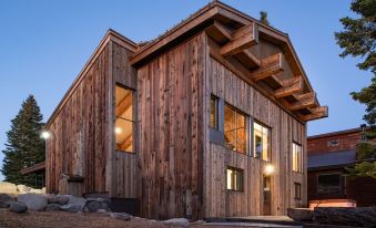 SRH is a rustic but modern chalet with a multi-level great room supported by old growth beams salvaged from Terminal Pier Long Beach and redwood siding sourced from an abandoned train snowshed. The new kitchen keeps with the theme by using railroad spikes for hardware, but no matter how rustic certain elements might be, SRH has all the latest modern amenities:
