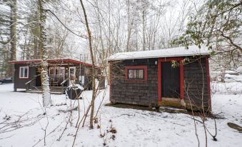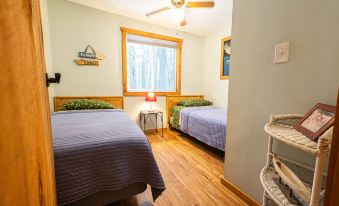 Ellis has two bedrooms, one with a queen bed and one with two single beds. The detached bunkhouse has 3 single beds and is available for larger groups in the summer only. The space is newly remodeled and very cozy! Full kitchen with 4 burner stove and oven, refrigerator, and microwave. The kitchen has a table with 4 chairs and a sofa that can one person can sleep on. The bathroom has a shower, small sink and toilet. There is no TV. (you won't miss it, we promise!) Ellis has a lovely porch on the front with views of Beach Pond. This is not a secluded cabin. There is a house next door, another cabin behind, and a camp trailer that is occasionally occupied across the driveway. See the aerial photos in the listing to get a better feel for the layout.