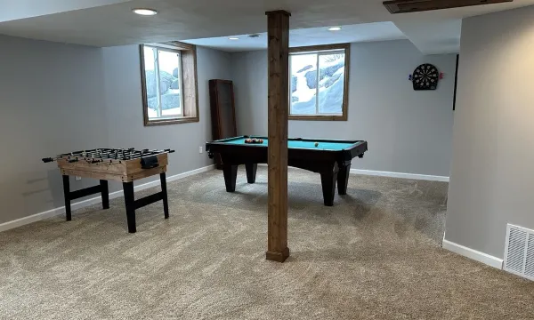 Located in a quiet neighborhood surrounded by wildlife. Concrete patio is perfect for bonfires and family bonding. Too cold outside? Enjoy a movie curled up in a blanket with a bowl of popcorn in the home theatre room. The basement is an open concept with a bar, pool table, dart board, TV and kids foosball. Laundry is located in the basement half bathroom. Each bedroom has a TV. The kitchen is spacious with plenty of counter space. Master bedroom has a king bed with it's own bathroom with a walk in shower. Located in a quiet neighborhood minutes from Elkhart Lake, Kohler, and Lake Michigan. Sleeps 7 comfortably. More Photos coming soon!About pets:Pets allowed: dogs and cats (limit 2 total).About checkOut:Check out before 11:00 AM.About children:Children allowed: ages 0-17.About checkIn:Check in after 3:00 PM.About smoking:Smoking is not permitted.About minBookingAge:Minimum age to rent: 18.About events:Events allowed: family gatherings and birthday parties.Maximum event attendees: 20.