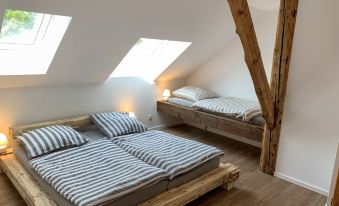 Large cottage "Siebelshoern". In the district of Willmsfeld, on the outskirts, 5 km from the centre of Westerholt, 18 km from the sea, 3 km from the lake, 30 km from the beach. For shared use: children's playground (swing). In the house: lounge, central heating system, washing machine (for shared use). Parking at the house. Shop 5 km, grocery 5 km, restaurant 5.5 km, bakery 5 km, café 5.5 km, bus stop 900 m, railway station "Norden" 21.5 km, ferry "Bensersiel" 19 km, sandy beach "Norddeich" 30 km, outdoor swimming pool 14 km, indoor swimming pool 14 km, bathing lake "Tannhausen" 3 km. Golf course (18 hole) 19 km. Please note: car recommended. On the estate animal husbandry. "Langeoog", 2-room apartment 70 m2 on 2 levels, on the ground floor. Tasteful and cosy furnishings: living/dining room with satellite TV (flat screen). Exit to the terrace. Kitchenette (dishwasher, 4 ceramic glass hob hotplates, toaster, kettle, microwave, electric coffee machine). Sep. WC. Upper floor: 1 open room with sloping ceilings with 1 bed (80 cm, length 200 cm), 1 double bed (2 x 90 cm, length 200 cm). Shower/WC. Terrace furniture. Facilities: children's high chair (extra). Internet (WiFi, free). Please note: non-smokers only. Maximum 1 small pet/ dog allowed. Smoke alarm.