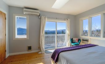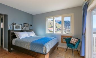 The upper level's bedrooms are across the hall from one another for a layer of privacy. The main bedroom features a king-sized bed under a skylight and a private bathroom with a shower and spa tub. The second bedroom features a queen-sized bed, its own private bathroom, and the best sunrise views in the house. Both upstairs bedrooms include sliding glass doors to a shared deck with spectacular views of the river and mountain.