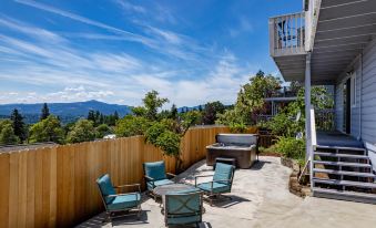 The bottom floor offers separate space for multi-family and multi-generational groups. This homey suite includes a kitchenette, a small dining table, a seating area, and a third bedroom featuring a queen-sized bed with a Mt. Hood view. The sliding glass door in the suite opens to the yard, where you can enjoy the spacious hot tub.