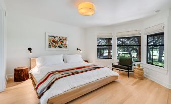 Heading up to the second floor, you will enter into the master suite. This private and spacious room brings luxury to your next vacation! With a king bed, beam-lined vaulted ceilings, and a cute seating area, you can relax beneath the stars in this Wimberley gem! The ensuite bathroom is even more to write home about! With a clawfoot tub, spacious walk-in shower, and a gorgeous double-vanity, you could spend all your time in here and disappear from reality! Bright patterns and golden accents warm this space and allow you to relax or prepare for your next Hill Country adventure! The Main House also features a second bedroom on the main floor, complete with a king bed and bay-style windows to wrap you into its cozy atmosphere! The ensuite bathroom features a gorgeous walk-in shower with bold green tiles and light wood accents, grabbing the earthy tones of D2 Farms!