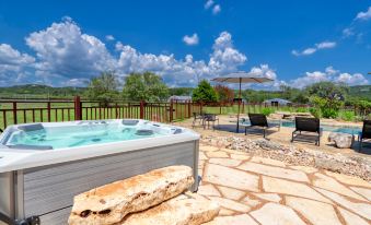 In the backyard, guests get a gorgeous view of the Hill Country while relaxing in the large inground swimming pool! This outdoor space is perfect for families to spend their time during the day as the patio features picnic tables for everyone to enjoy a meal in the beautiful Wimberley weather! At night, parents can grab their favorite cocktail and take a dip in the hot tub after a long day. Families are also encouraged to share their favorite stories while roasting marshmallows around the firepit!