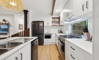 The open-plan design seamlessly connects the spacious living, dining, and kitchen areas, providing a perfect flow to the green outdoor spaces. Our kitchen is the heart of the home, and fully equipped with everything you need to cook up a storm!