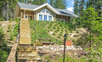 Wooded and sloped plot, with steep stairs leading to the shore. The cabin is situated high up, offering a good view of the lake.