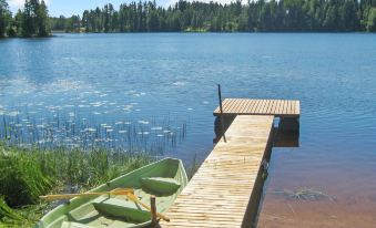 The sauna is equipped with a wood-burning stove, and the washroom includes a shower and a WC. In the yard, there is an atmospheric grill hut, and the terrace also has a gas grill. Steep stairs lead from the cabin down to the shore. The shallow shoreline has a sandy bottom. There is about 1 meter of water depth at the end of the pier.