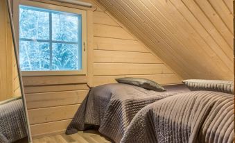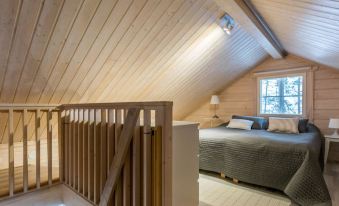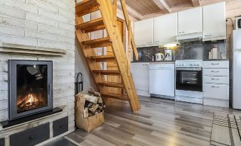 The cabin's living area features a dining table for four, a heat-storing fireplace, a living room/kitchen, a TV, and two armchairs. Access to a wood-heated sauna is available through the inside or from the terrace. The bathroom includes a shower, a WC, and a washing machine. The loft has four beds, and there is a child safety gate upstairs.