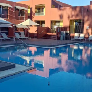 Хороший отель, недалеко от аэропорта, рядом магазины и стоянка. В номкре кондиционер, чайник, гладильная доска, утюг. Чистое постельное бельё, много полотенец, в том числе для бассейна. Насекомых в номере нет, комфортный номер. Телевизор есть, работает, но программ нет, так как далеко и не ловит, но можно подсоединить приставку. Для отеля в центре почти пустыни очень хорошо.