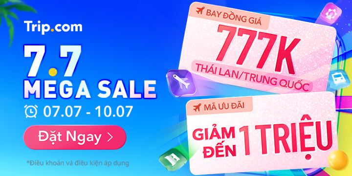 Từ 7/7 đến 10/7, khám phá ưu đãi Mega Sale 7.7 từ Trip.com: bay Thái Lan, Trung Quốc, Hàn Quốc hoặc Malaysia chỉ từ 777K (giá bao gồm thuế phí*), săn voucher trị giá đến 1 triệu đồng và tận hưởng ưu đãi khách sạn giảm giá lên đến 70%!
