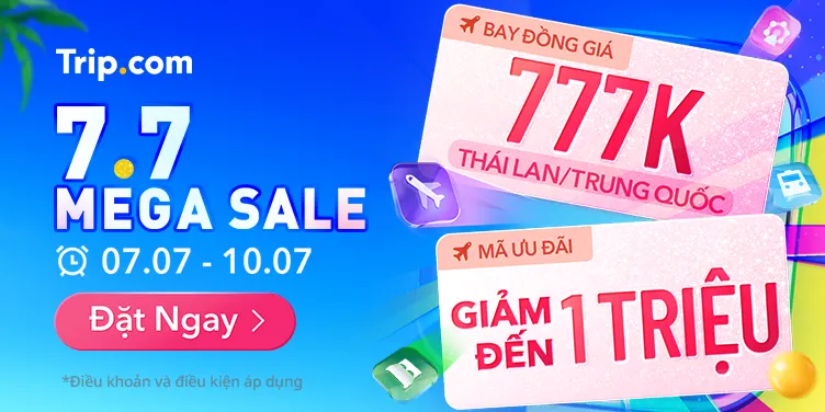 Từ 7/7 đến 10/7, khám phá ưu đãi Mega Sale 7.7 từ Trip.com: bay Thái Lan, Trung Quốc, Hàn Quốc hoặc Malaysia chỉ từ 777K (giá bao gồm thuế phí*), săn voucher trị giá đến 1 triệu đồng và tận hưởng ưu đãi khách sạn giảm giá lên đến 70%!
