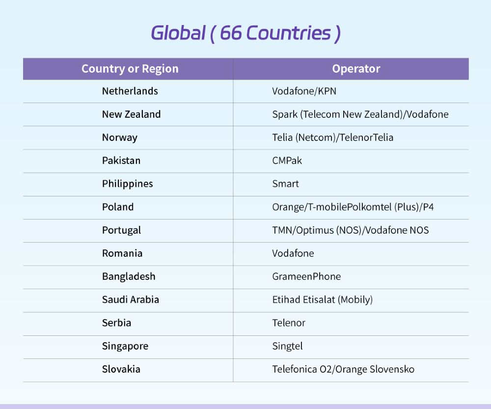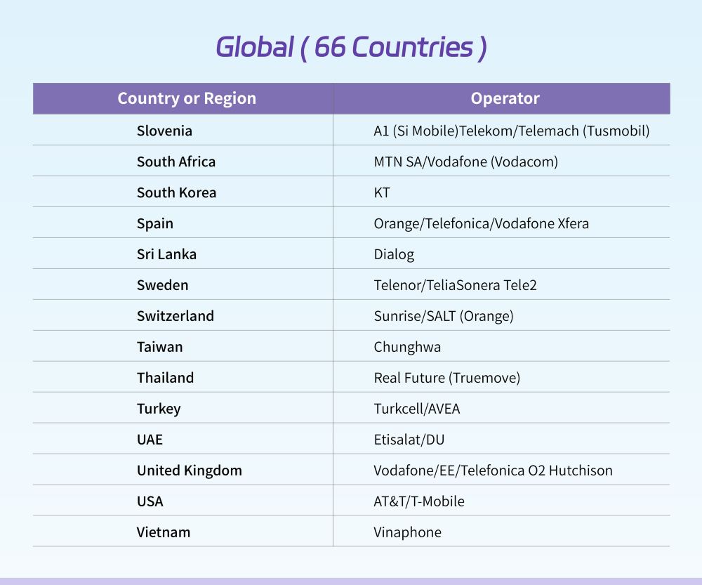 Khu vực phủ sóng: (Phạm vi phủ sóng sau đây chỉ bao gồm lãnh thổ chính của các quốc gia, không bao gồm các vùng lãnh thổ hải ngoại hoặc các khu vực phụ thuộc. Ví dụ: Hoa Kỳ được phủ sóng nhưng không bao gồm Guam.)