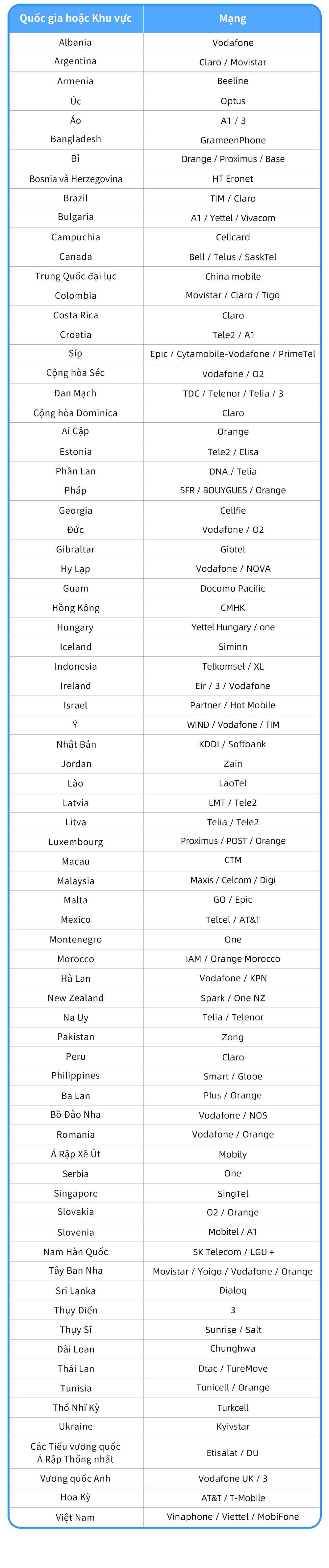 • Mạng: Thay đổi tùy theo khu vực; vui lòng xem bảng bên dưới để biết chi tiết.