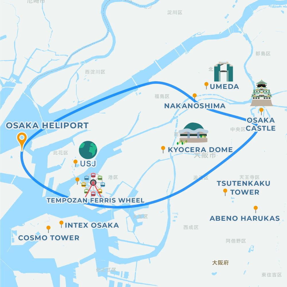 Khởi hành từ Sân bay trực thăng Osaka, tham quan USJ (Universal Studios Japan), Kyocera Dome, Lâu đài Osaka, Tsutenkaku, v.v., sau đó tham quan Tòa nhà Umeda, Tòa nhà Sky, v.v., rồi quay trở lại sân bay trực thăng.
